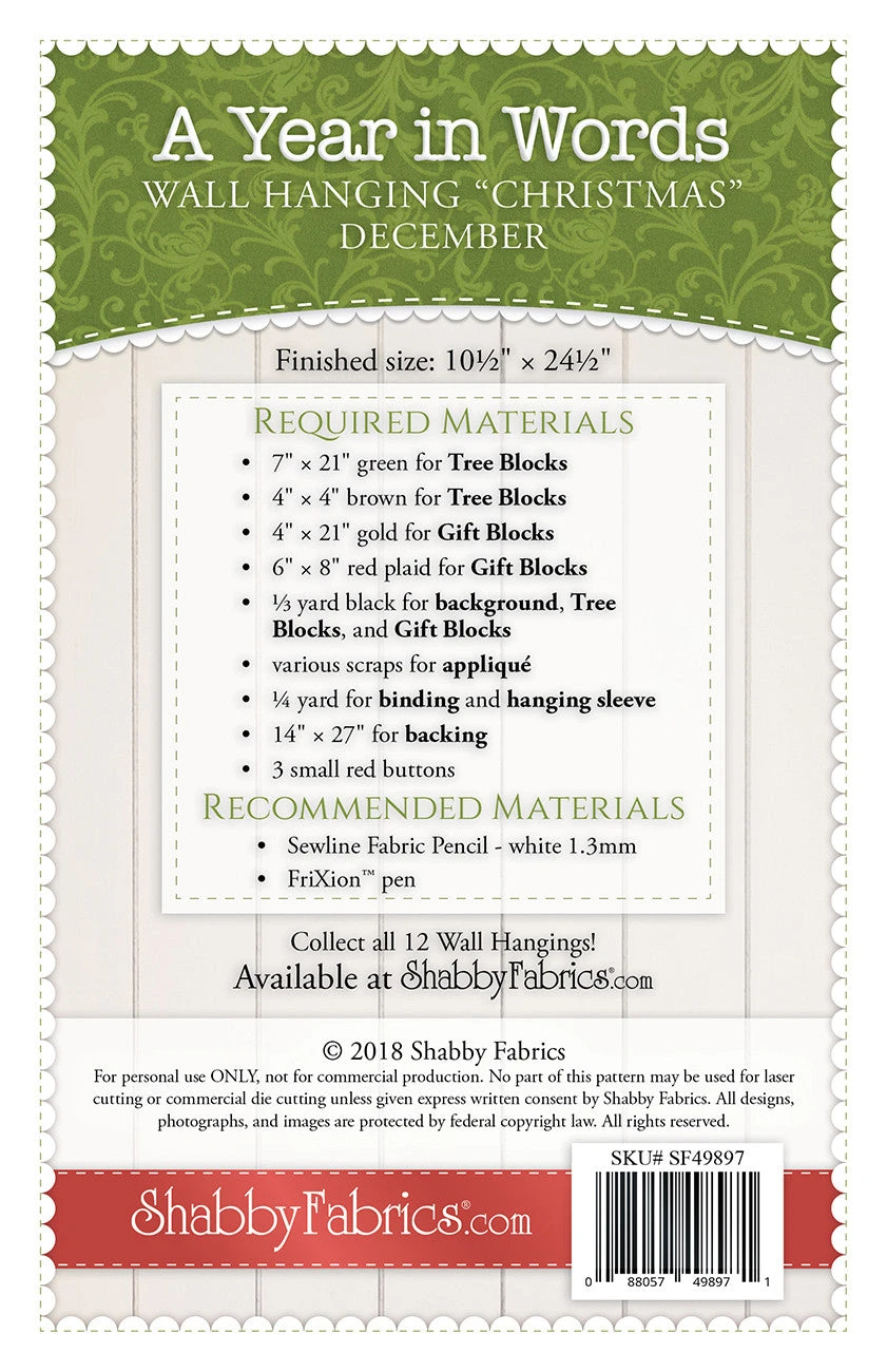 As you deck the halls this holiday, add a little extra festive touch to your decor with this Christmas wall hanging. Show off your piecing skills with simple but sophisticated trees and gifts. The easy appliqué features sweet details — a candy cane “R”, a holly to dot the “I”, and a Christmas tree “A” — that add to the fun of this holiday project. Finished wall hanging measures 10½” x 24½”.