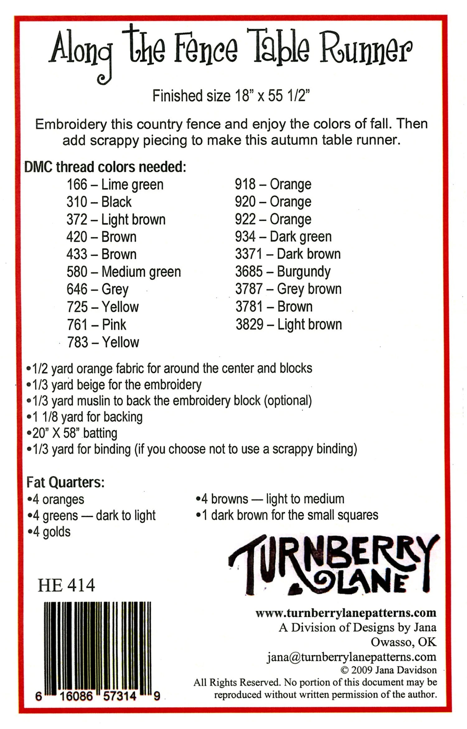 Embroidery this country fence and enjoy the colors of fall. Then add scrappy piecing to make this autumn table runner. 18in x 55-1/2in