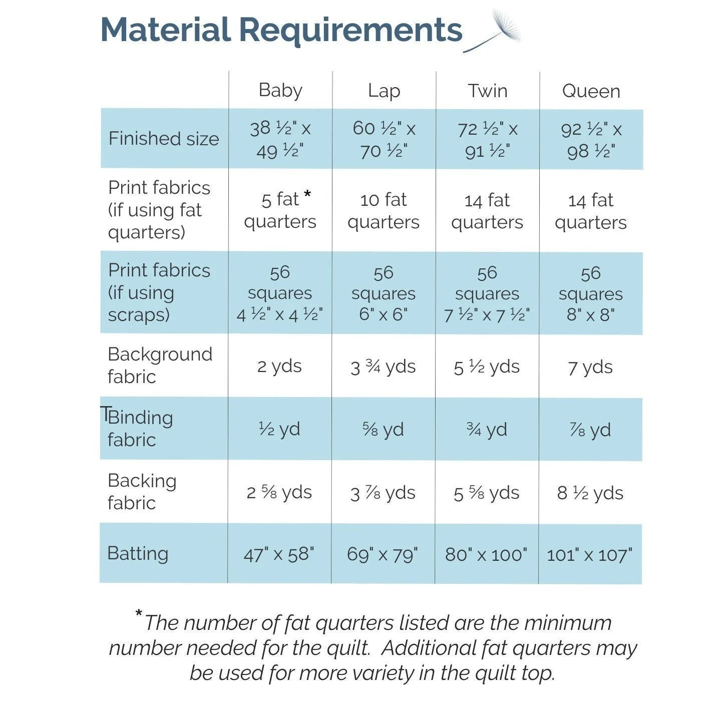 The pattern includes instructions for four sizes: baby, lap, twin, and queen. See the pictures above for illustrations of the different sizes and fabric requirements for each size.