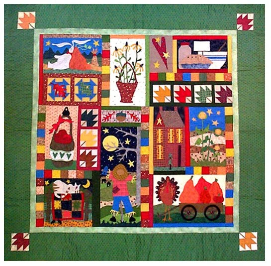 Autumn Joy is a magical 12-month block-of-the-month that captures the best of the harvest season with moonlit nights, harvest moons, pumpkins, and turkeys. The finished quilt measures 67 inches wide by 66 long. The pattern has both pieced and appliqued blocks. You will see the quilt come alive as you make the individual sections and join them together in Month Twelve.