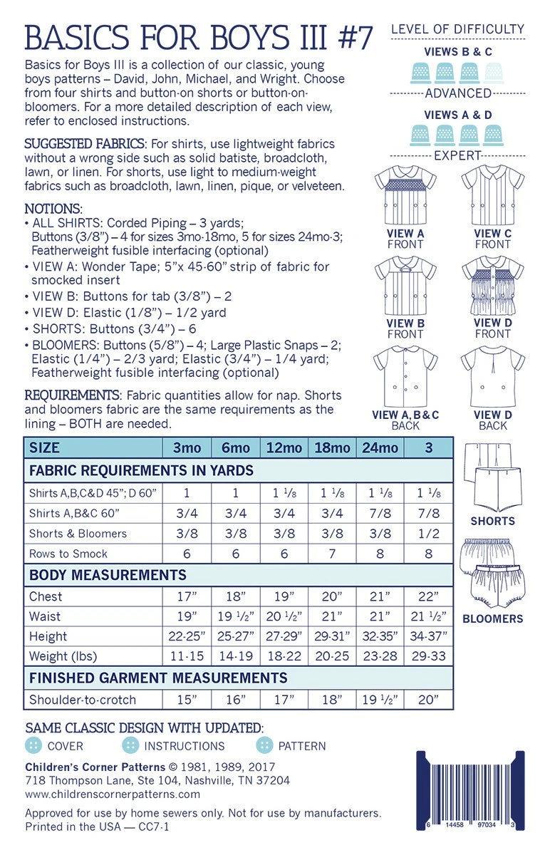 Basics for Boys III is a collection of our classic, young boys patterns – David, John, Michael, and Wright. Choose from four shirts and button-on-shorts or button-on-bloomers.