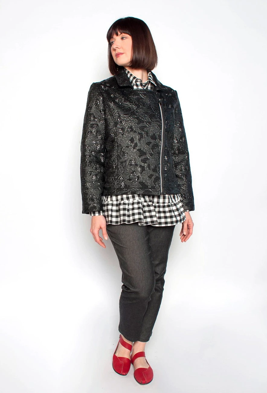 Jacket Semi-fitted moto jacket with princess seams and inseam pockets, notched collar and stand, angled zip front, and long two-piece sleeves. Fully lined.