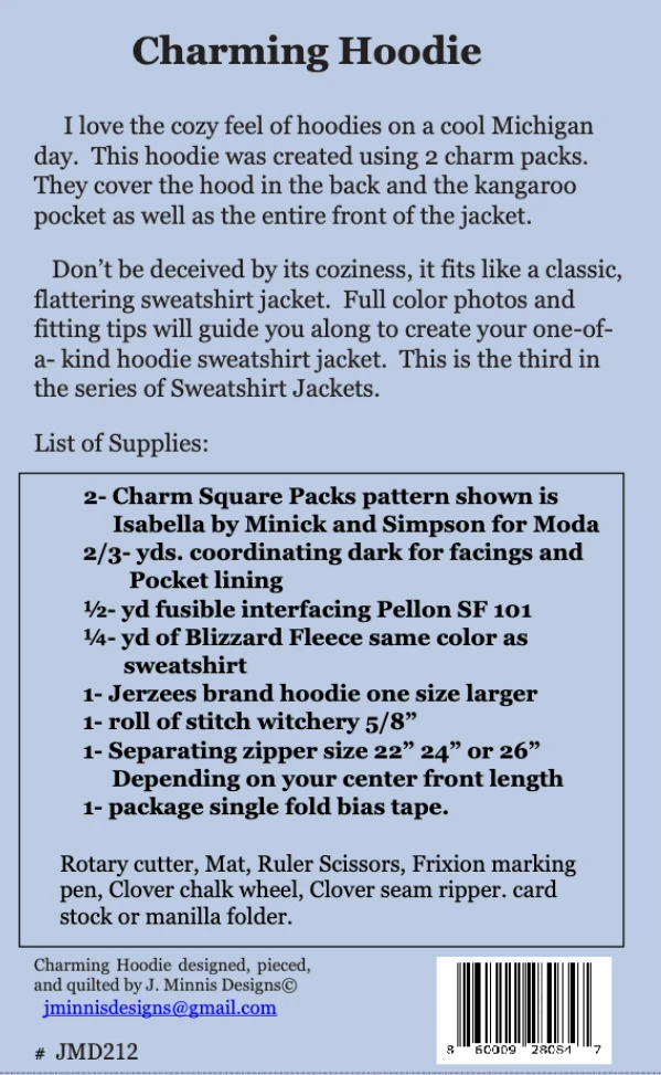 I love the cozy feel of hoodies on a cool Michigan day. This hoodie was created using 2 charm packs. They cover the hood and the back and the kangaroo pocket as well as the entire front of the jacket.