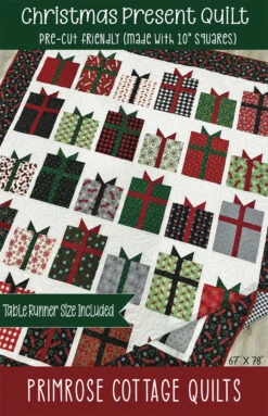 Christmas Present Quilt + Bonus Table Runner pattern. Pre-cut friendly (10″ squares) Quilt finishes at 67″ x 78″. Table runner finishes at: 16″ x 48″ Great beginner pattern!