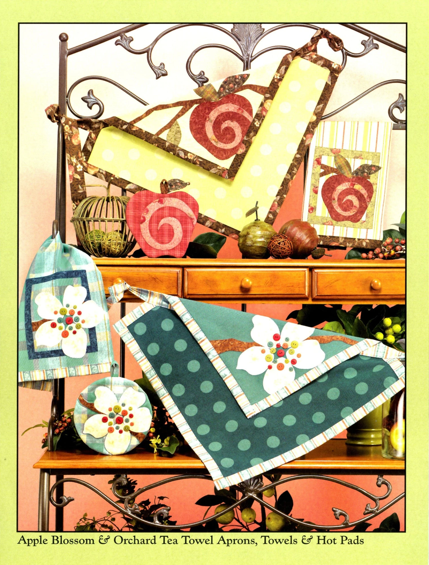 The apple themed projects include: quilts, pillow, table runner, tea towels, table topper, mug cozies, pillows, hot pads, aprons, pincushion, gift bags and more.