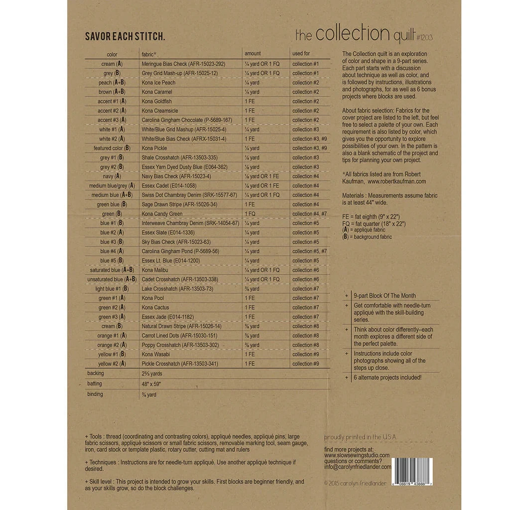 Collection is a printed pattern that includes all 9 portions of the Block-Of-The-Month project.