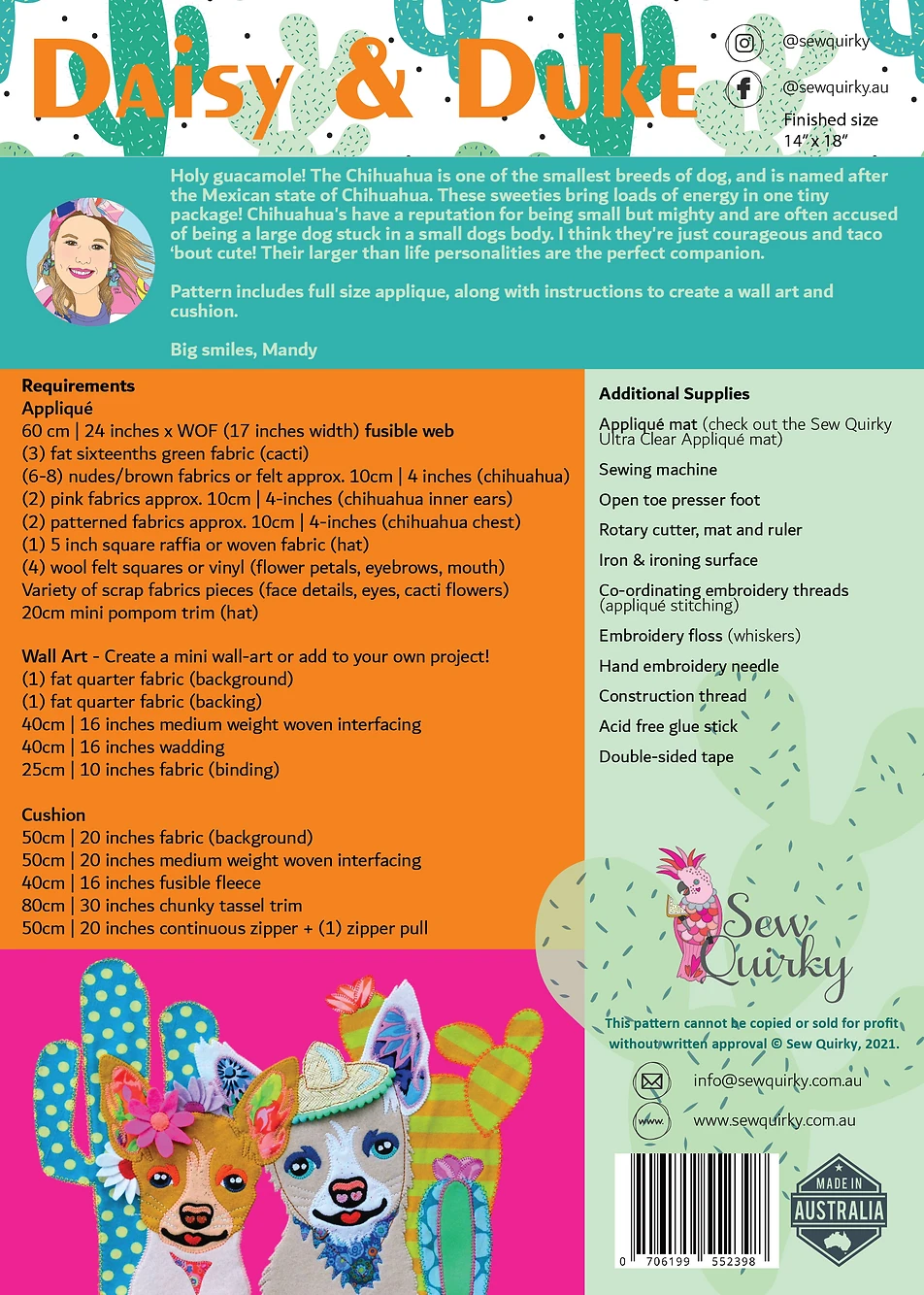Holy guacamole! The Chihuahua is one of the smallest breeds of dog, and is named after the Mexican state of Chihuahua. These sweeties bring loads of energy in one tiny package! Chihuahua’s have a reputation for being small but mighty and are often accused of being a large dog stuck in a small dogs body. I think they’re just courageous and taco ‘bout cute! Their larger than life personalities are the perfect companion. Pattern includes full size applique, along with instructions to create a wall art and cushion.
