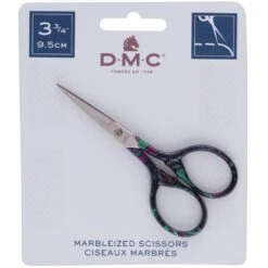 A premium quality scissor with stainless steel blades and unique decorative marbleized handles.