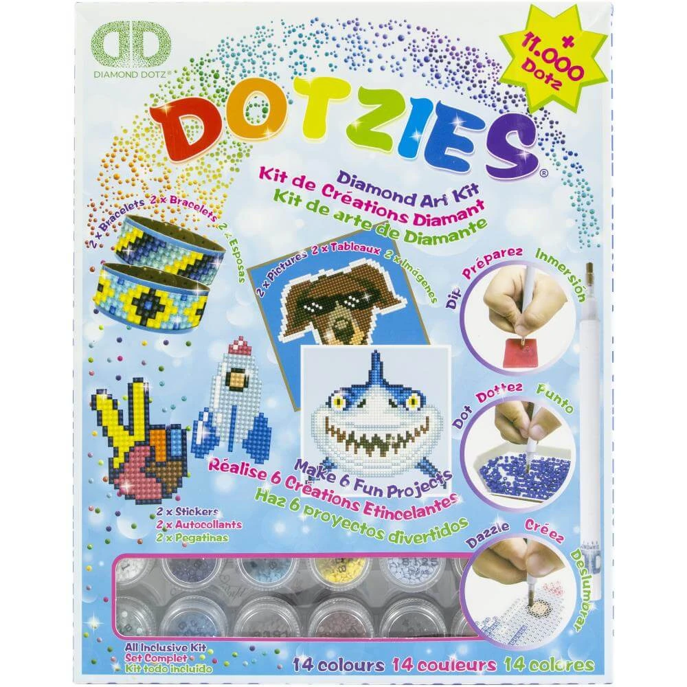 Make six fun projects! This 9.75×12.5×1.75 inch package contains two bracelets, two stickers, two pictures, two wax pieces, two Diamond Dotz stylus, two mini trays, 1.9oz of pre-sorted Diamond Dotz and instructions.