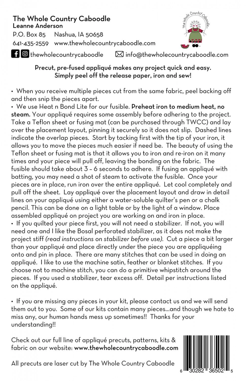 Includes precut fused applique and finished drawing for assembling applique