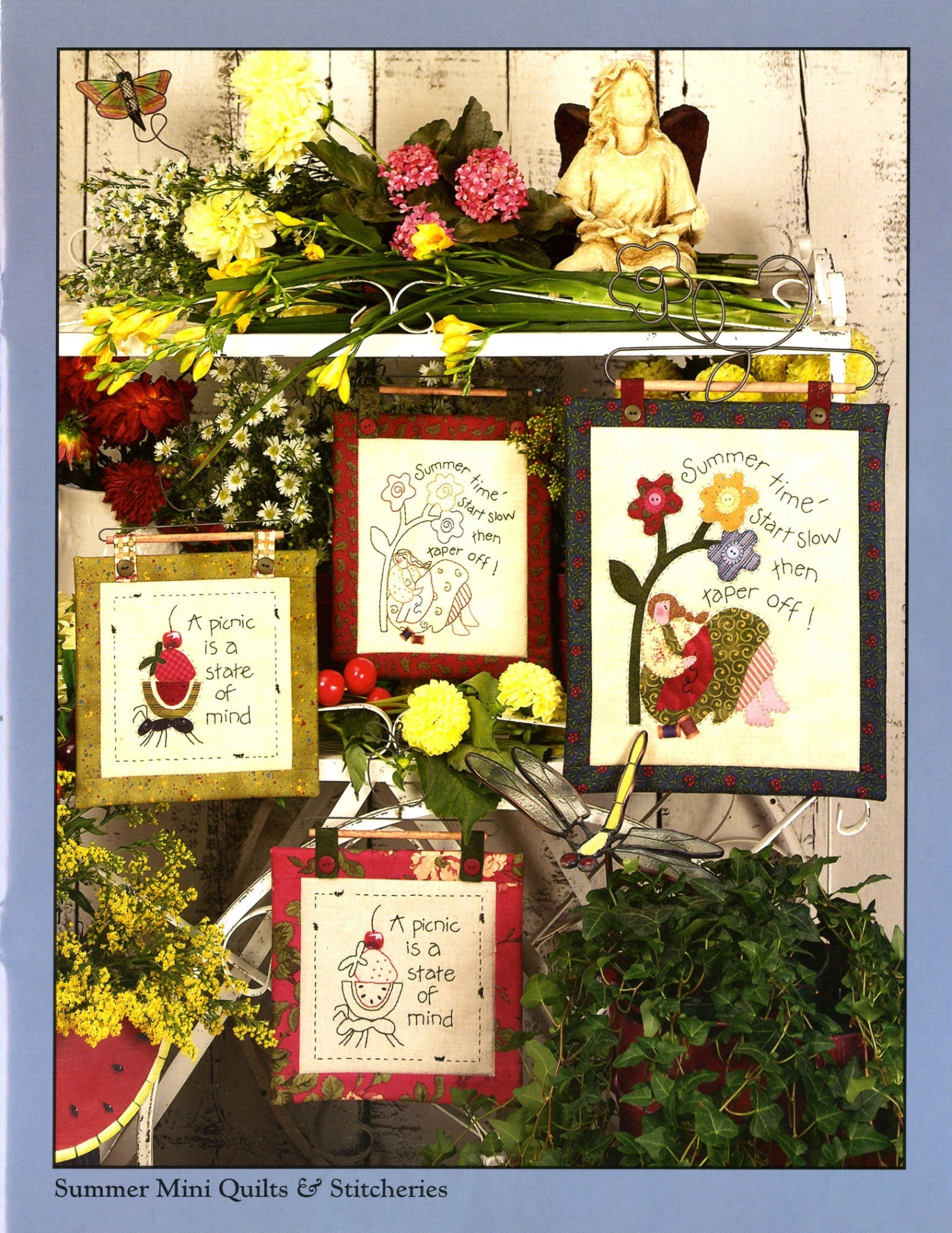 It’s the lazy days of Summer and picnic time is here! So relax and make it easy on yourself with any of these 27 quick and easy projects to share or to sweeten your home. Summertime themes patterns including quilts, stitcheries, tea towels, garland, hot mitts, table runner, place mats, aprons and more.