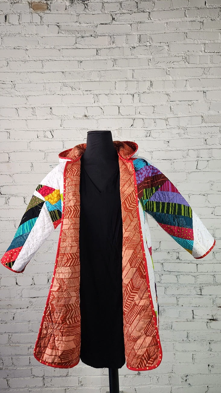 The Elemental Coat is a loose-fitting, slightly A-line coat with options! Choose from full-length, mid-length and cropped length, as well as 3/4 or full-length sleeves,. Pattern includes options for adding a hood or collar, and for using a button loop closure. Whether re-purposing quilts, using new fabric combinations or quilt-your-own with coordinating Quilted Element modules, the Elemental Coat pattern is designed bring quilters into the garment-sewing world and give them the opportunity to let their quilt-making skills shine.