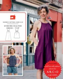 The Enmore Halter Dress + Top is a halter-neck sundress that features narrow straps, a built-in bra, and pockets. The shelf bra includes cup sizes to help you get a great fit. This style can be cut on grain or on bias if you want more drape to the fabric. View B is a shorter, blouse-length version of the dress.