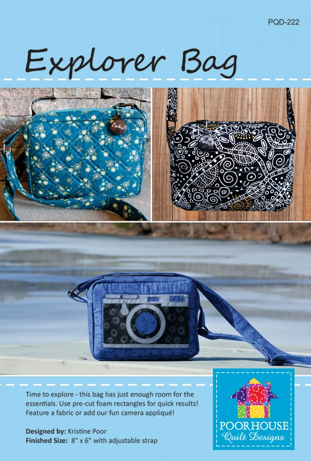 Time to explore – this bag has just enough room for the essentials. Great for a quick class with straight line quilting. Pattern comes with a fun zipper pull!