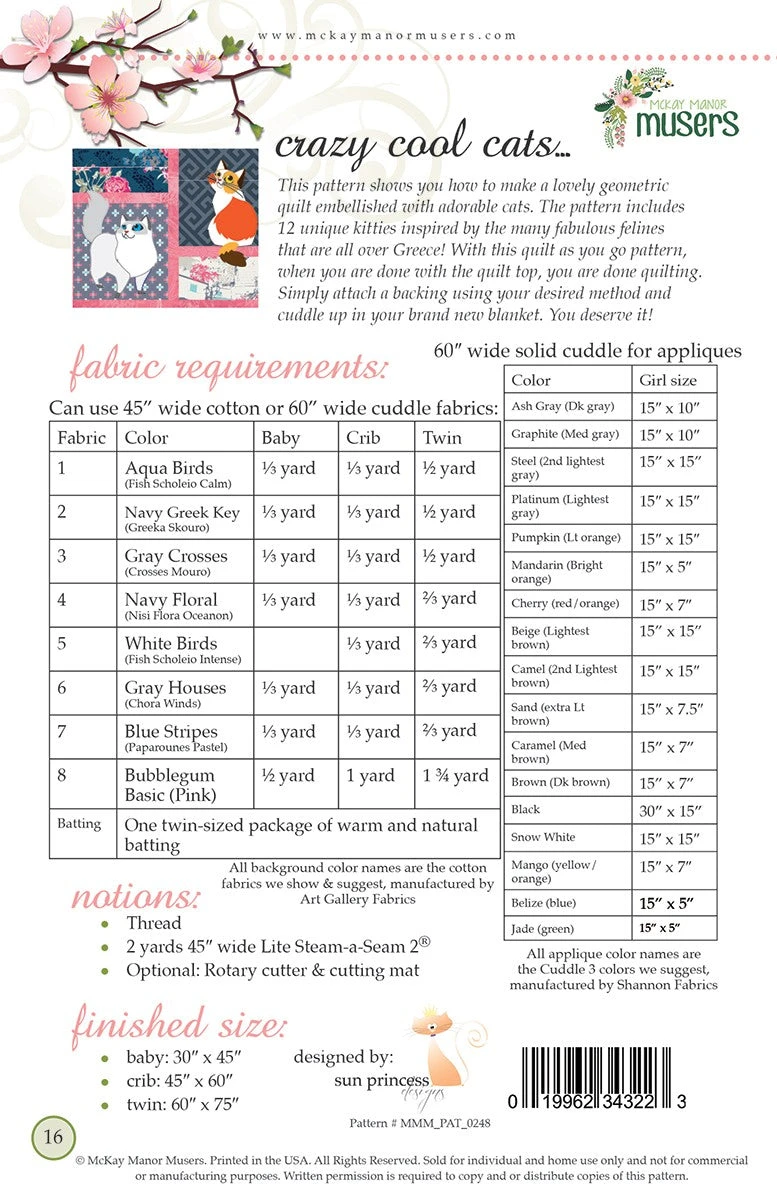 This pattern features 12 unique cats inspired by the many fabulous felines we saw while we were in Greece. Their names come from the Gods, Goddesses and and the Island. The sew and flip method makes it easy to create just one block at a time and they you sew the blocks together and add the backing.