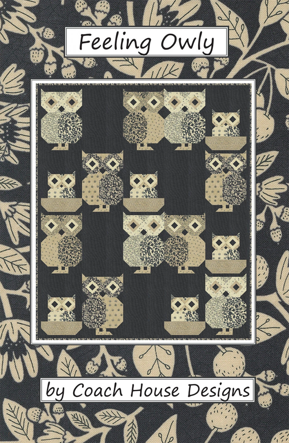 Super fun owl quilt with adults and babies in nest set against a dark backgroun.