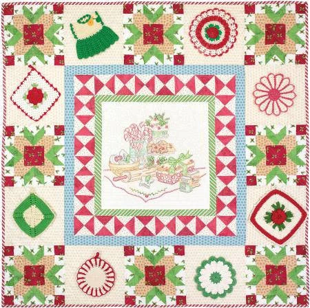 The tastes, scents, warmth, and love of Grandma’s kitchen are captured in the simple crayon tinted embroidery. Then, vintage potholders on the border bring those memories to life! Border can be completed without the addition of potholders. Finishes 45 1/2in x 45 1/2in.
