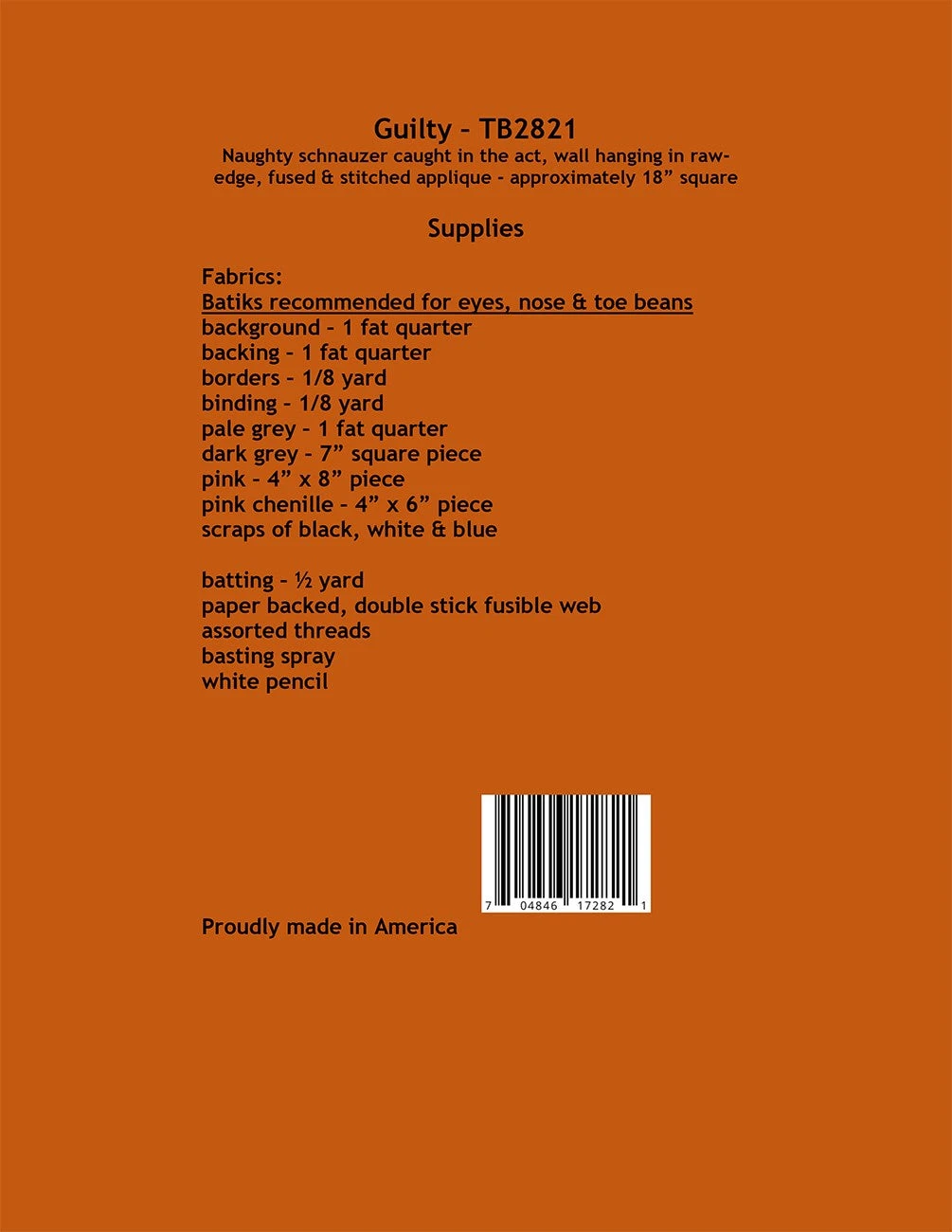 18in square wall hanging of a sweet grey schnauzer caught in the act of chewing a pink chenille bedroom slipper. The evidence is there for all to see – a chewed hole & bare patches in the slipper & telltale pink chenille bits on the floor. The guilt is evident in the cute schnauzer’s bright blue eyes. Executed in raw-edge, fused & machine stitched applique.