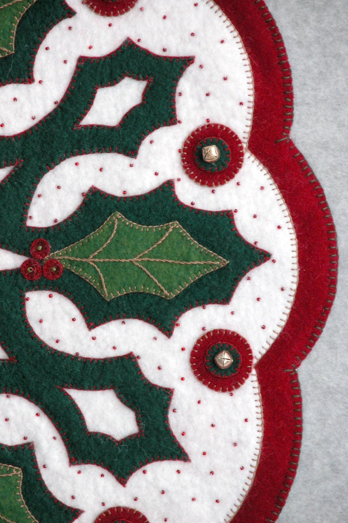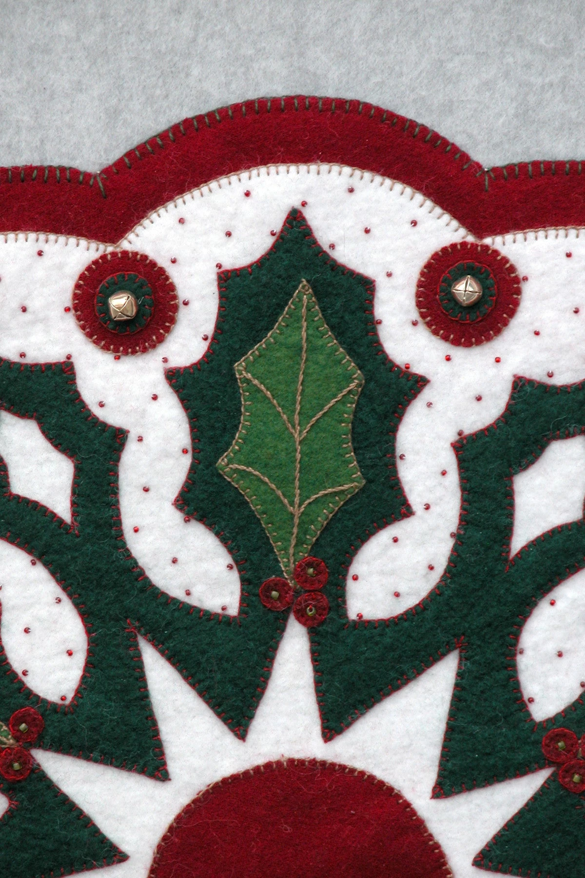 21″ Applique Pattern designed in wool felt or felted woven wool. A wonderful winter holiday topper featuring beautiful green holly leaves embellished with embroidery and set against a sparkling beaded background. Little jingle bells around the perimeter add a festive touch.