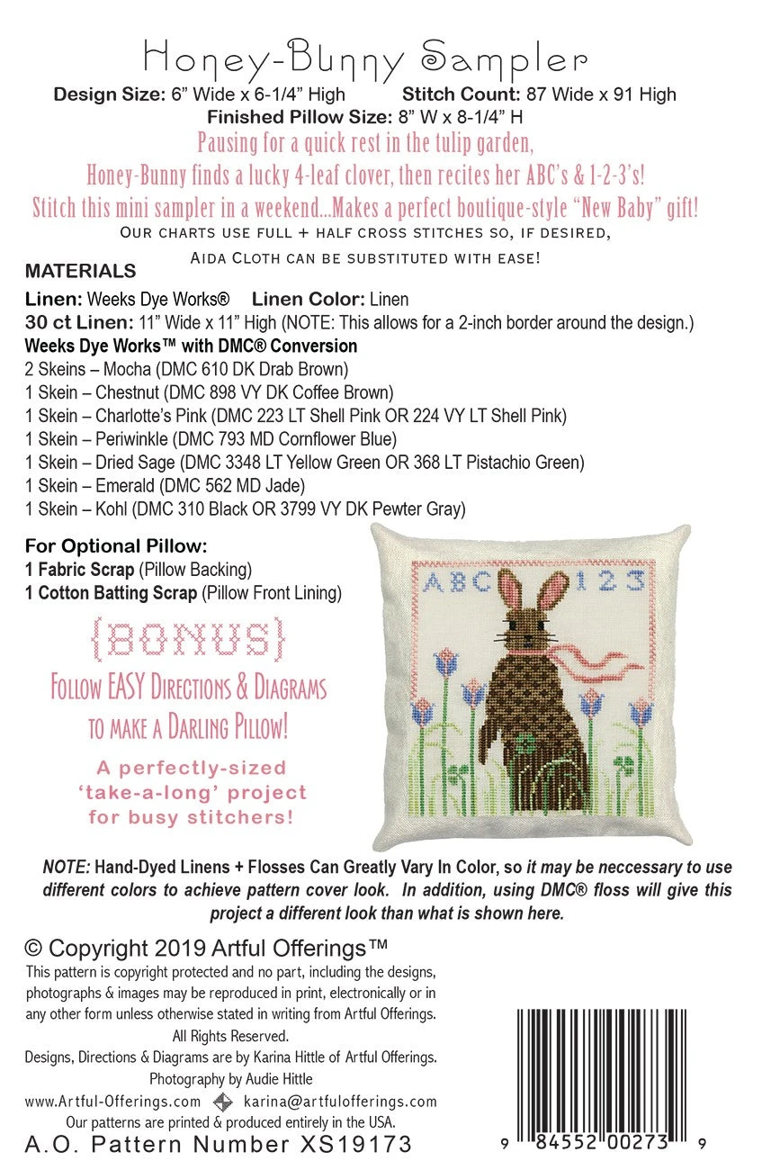 Pausing for a quick rest in the tulip garden, Honey-Bunny finds a lucky 4-leaf clover, then recites her ABC’s & 1-2-3’s! Stitch this mini sampler in a weekend…Makes a perfect boutique-style “New Baby” gift!