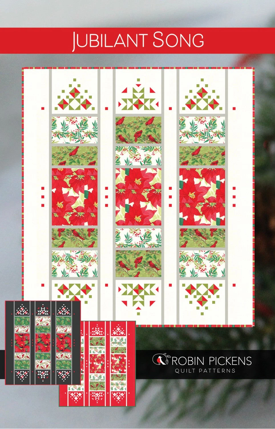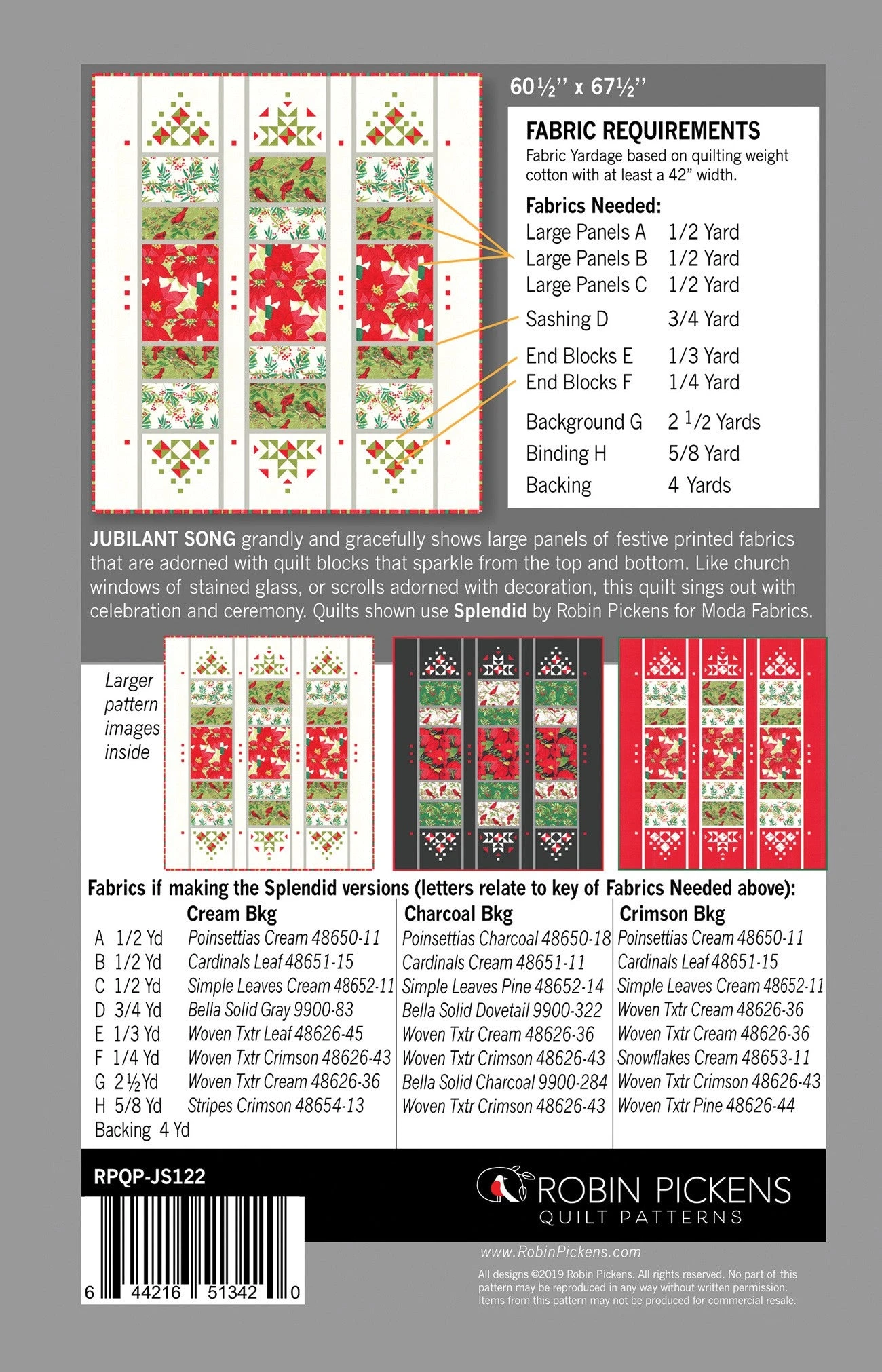Jubilant Song is a 60 1/2 x 67 1/2 inch lap quilt that is reminiscent of cathedral windows or stained glass. The quilt uses three vertical panels to show off big areas of large-scaled prints or main focal prints, framed by thin sashing and very decorative and lacy tops and bottoms. The ends of the panels have a sparkly impact when shown on a dark background or can play with red and green in a Christmas-like theme. Shown in holiday fabrics (Splendid by Robin Pickens) but would be an elegant quilt in any fabrics and color scheme. Piecing utilizes half square triangles and flying geese and sub-cutting joined strips.