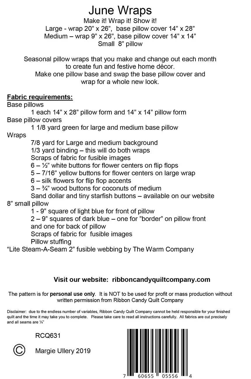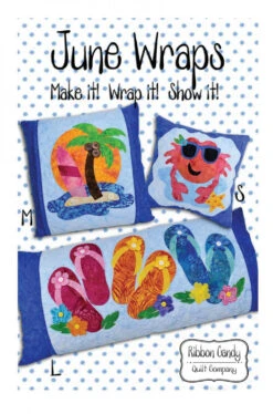 June Wrap set is just perfect to celebrate the hot days of summer. Enjoy the beach themed wraps. Large pillow is 14 x 28 inches with the wrap finishing 20 x 26 inches. The medium pillow is 14 inch square with the wrap measuring 9 inches wide and 26 inches long. Small pillow is 8 inch square. The large and medium are perfect sizes for benches, chairs, and sofas. The mini pillow is just right to use in a basket and or add to a shelf. These make great gifts too. All images are appliqued with fusible webbing.
