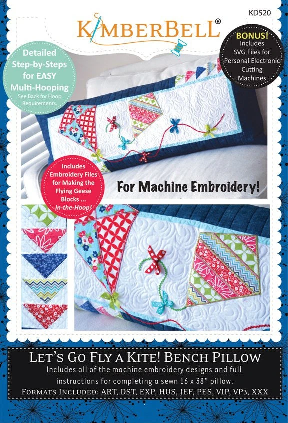 Now you can MACHINE EMBROIDER Kimberbells popular series of interchangeable bench pillow covers! Start by making one large “bench pillow” form. Then change out a new cover for that pillow form for each season or holiday! Machine embroidery appliques, instructions for making the pillow form, as well as the Lets Go Fly a Kite� cover are all included. Also includes embroidery files to piece� those Flying Geese� border blocks, in-the-hoop! Detailed step-by-step instructions for multi-hooping make this a fun project to decorate your home! Files formats include: ART, DST, EXP, HUS, JEF, PES, VIP, VP3, and XXX Bonus “SVG” files are included for use with your personal electronic cutting machine. There are 2 hooping� options available on the CD to complete the Lets Go Fly a Kite� Bench Pillow. You can choose which option works best with the hoop you have. Common names of the hoop options are a 6×10 and 9×14. Since hoop sizes vary depending on brand of machine, the embroidery fields needed are listed on back cover of the CD. Be sure to check this back cover in order to make certain that your hoop will work with the specified embroidery fields needed. Finished size: Approximately 16in x 38in.