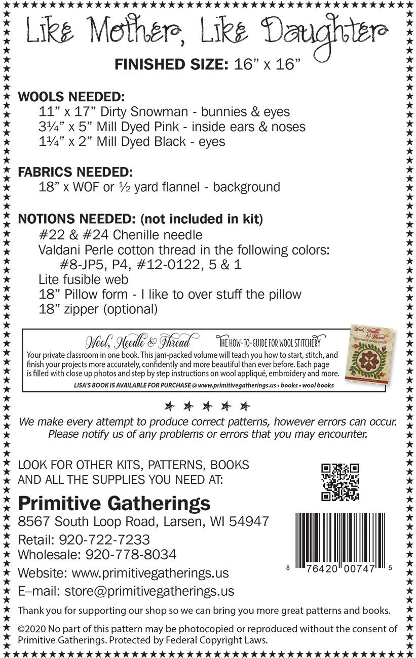 These two bunnies are patiently waiting for spring. Made with our wonderful wools this 16″ pillow is a great project to do while you have some time on your hands.