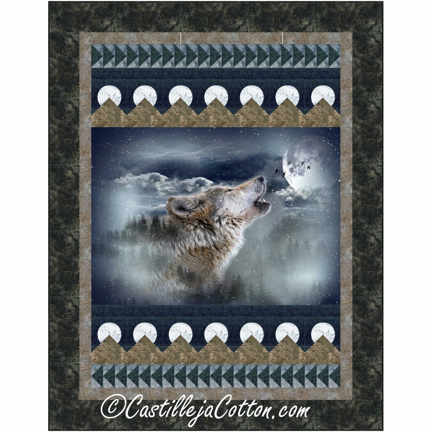 Country/Region of Manufacture: Canada Wolf panel with moon over mountain and flying geese borders.