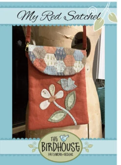 A shoulder satchel with pieced hexagon back and needle turn appliqué design on the front. Size fits an iPad mini. Finished size: 7″ x 9″ + strap.