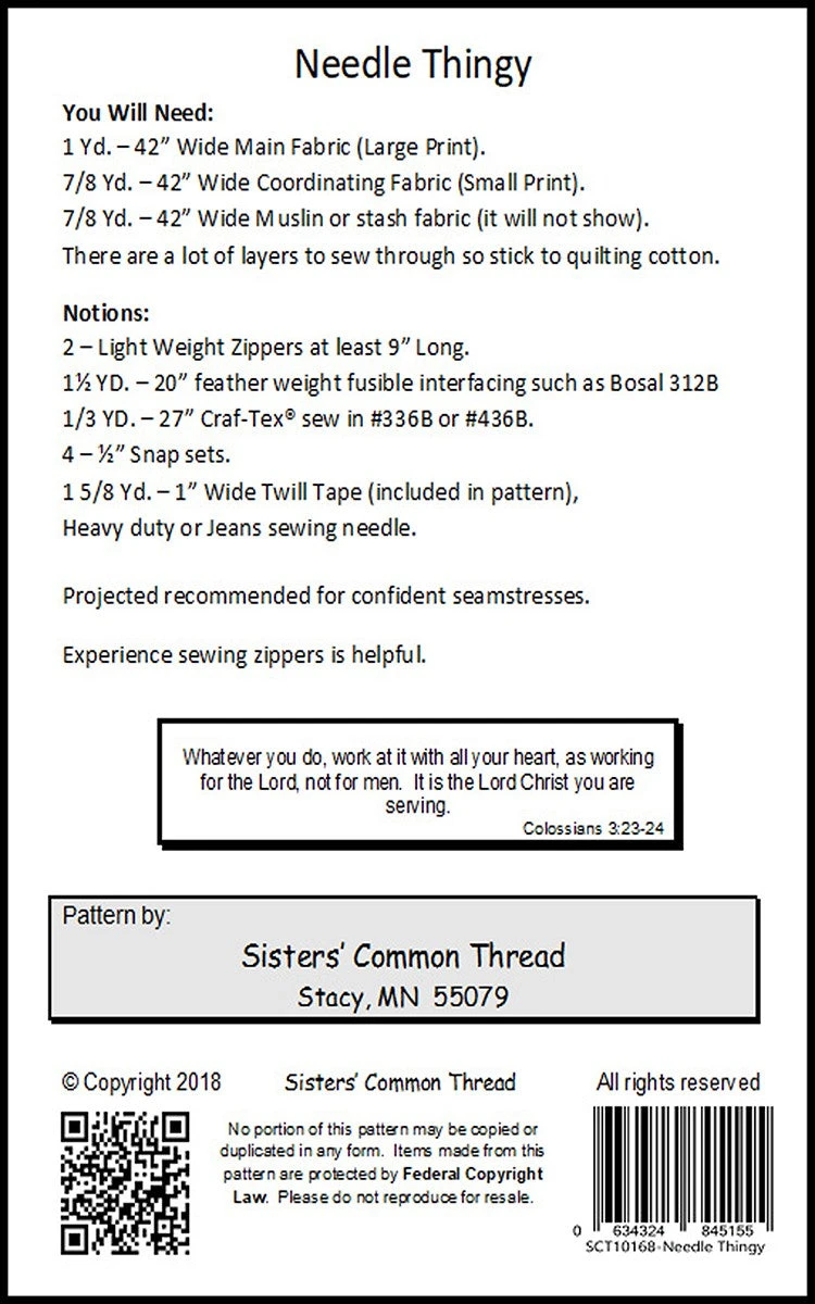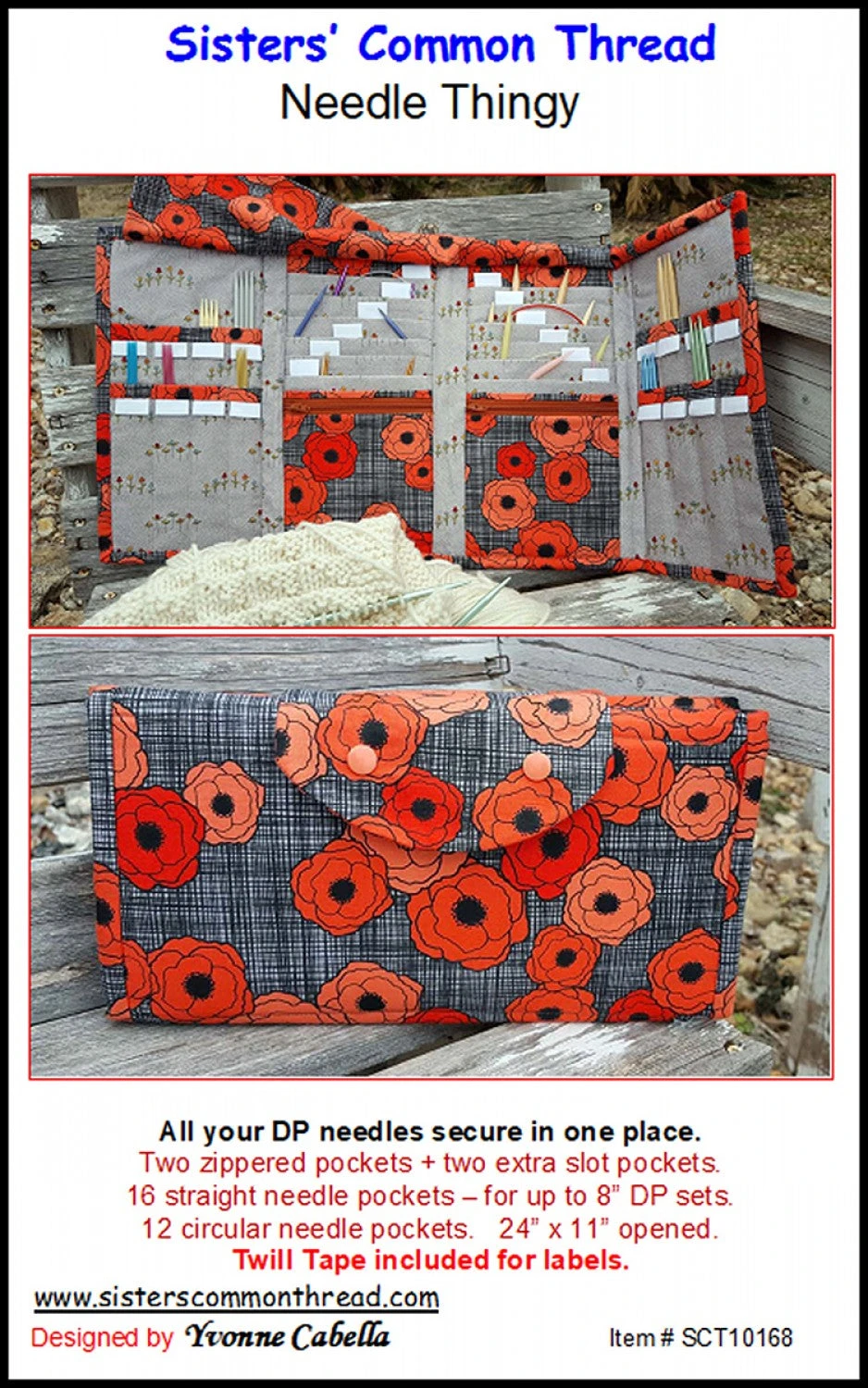 A place for your double point knitting needles. Secure in one place. Two zippered pockets + two extra slot pockets. 16 straight needle pockets – for up to 8in DP sets. 12 circular needle pockets. 24in x 11in opened. Twill Tape included for labels.SCT10168