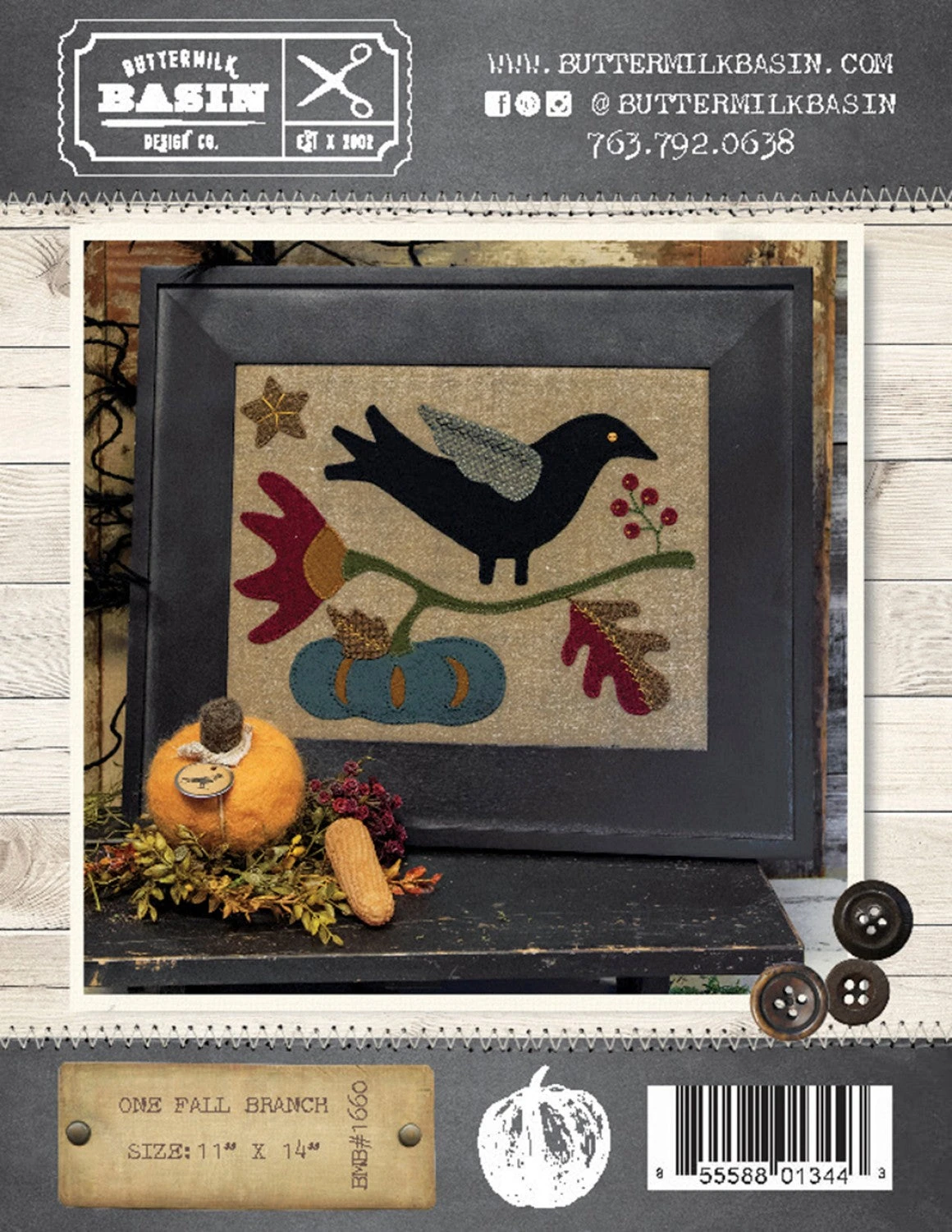 This fall branch is filled with the bounties of autumn in rich & warm shades of wool topped off with a crow. Size is 11in x 14in framed.