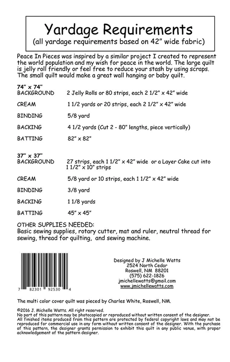 Peace In Pieces is another quilt in my jelly roll, layer cake and scrap reduction projects. Instructions for both a 37in x 45in and 74in x 90in project are included