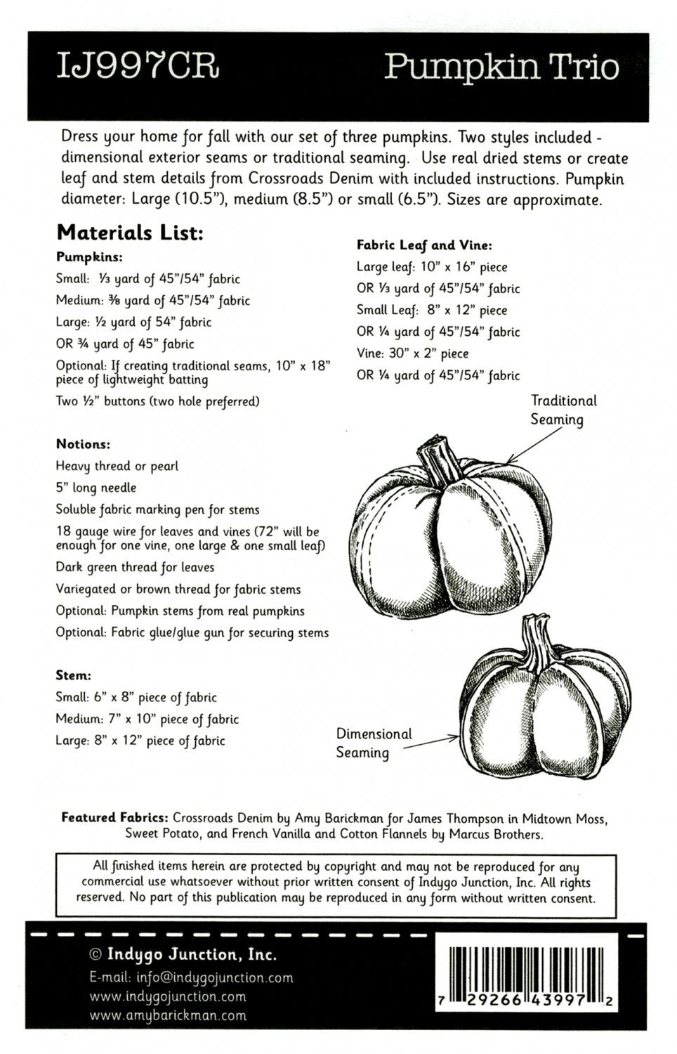 styles included dimensional exterior seams or traditional seaming. Use real dried stems or create your own leaf and stem details from Crossroads Denim. Pumpkins are large (12in D), medium (8in D) or small (6in D). Sizes are approximate.