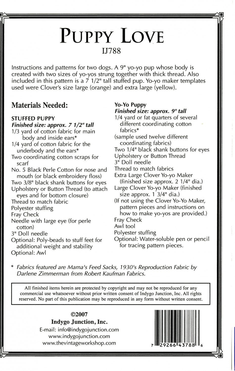 Instructions and patterns for two dogs. A 9� yo-yo pup whose body is created with two sizes of yo-yos strung together with thick thread. Stuffed yo-yos make the paw and tail. Also included in this pattern is a 7 1/2� tall x 7 1/2� long stuffed pup. Yo-yo maker templates used were Clovers size large and extra large which can be seen at item number 8702CV.