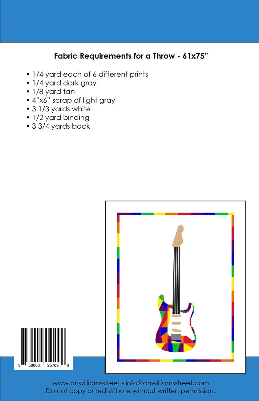 Rock Concert is a modern quilt pattern for an intermediate quilter featuring a foundation paper pieced guitar and basic pieced border. Quilt is a throw about 61×75″.