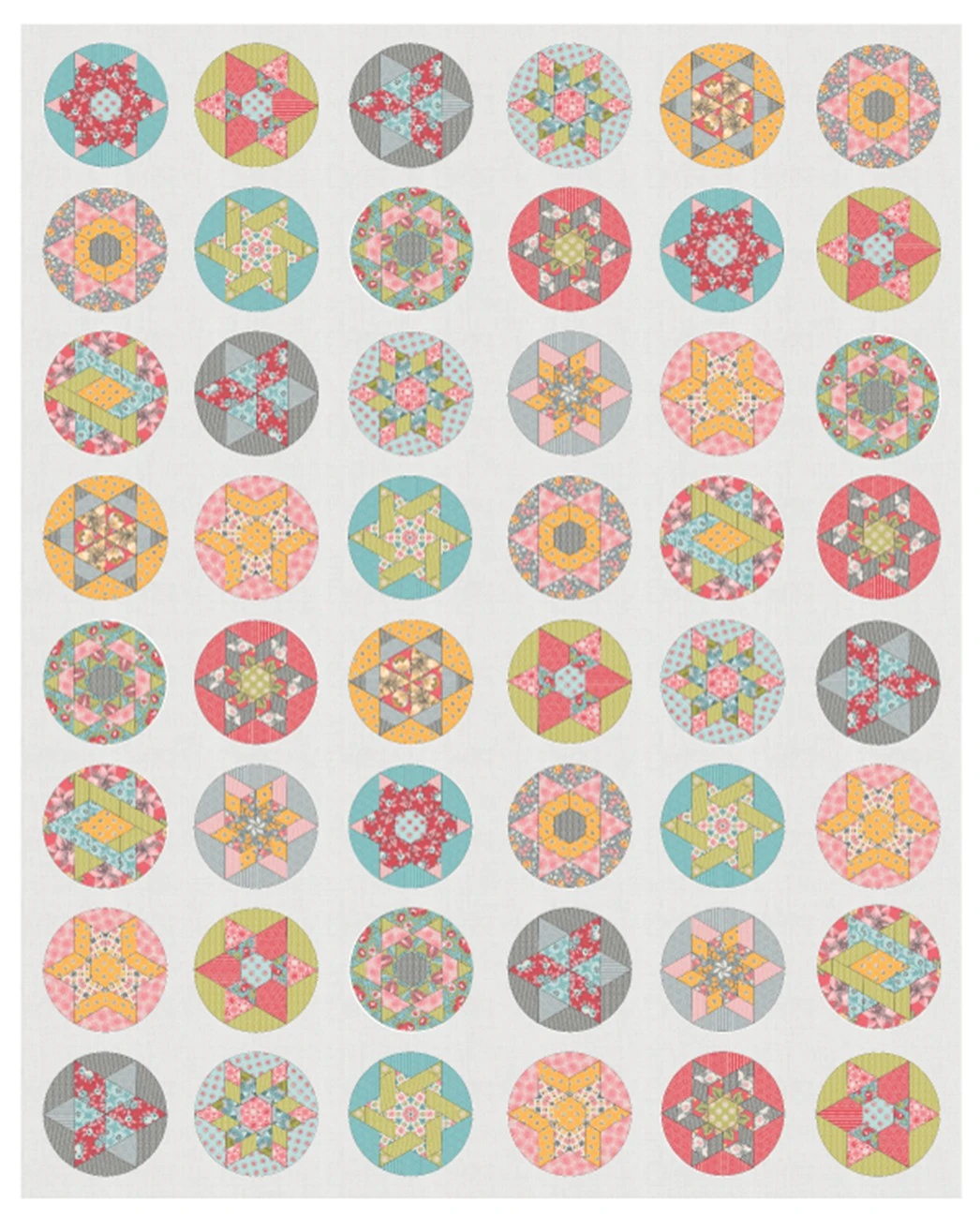 Round We Go Full Set Block of the Month includes 12 gorgeously packed Seed Packets each containing pattern instructions and papers, 1 design book, and 9 acrylic templates. Finished quilt size: 48in x 64in; designer recommends 58in x 74in for backing fabrics.