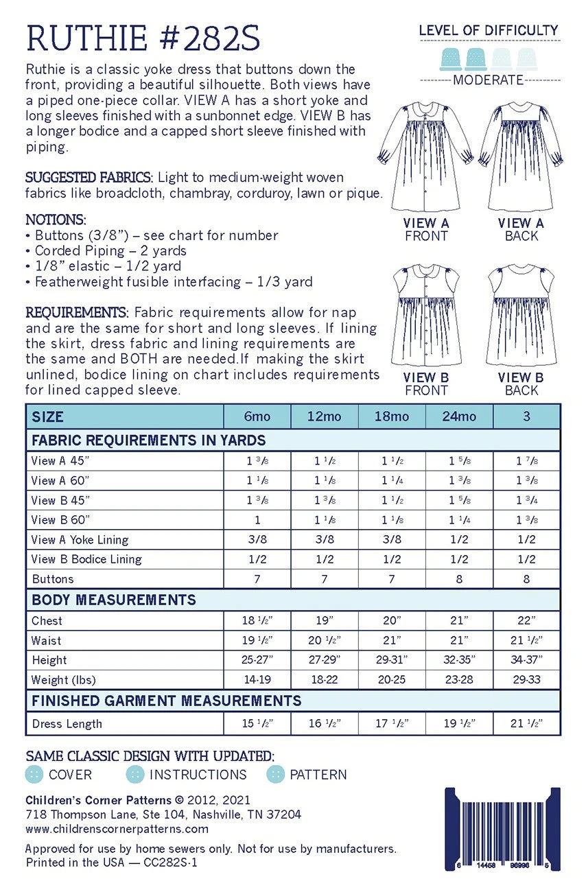 Ruthie is a classic Children’s Corner yoke dress that buttons down the front, providing a beautiful silhouette. Both views have a piped one-piece collar. View A has a short yoke and long sleeves finished with a sunbonnet edge. View B has a longer yoke and a capped short sleeve finished with piping. Includes Sizes 6 months – 3.