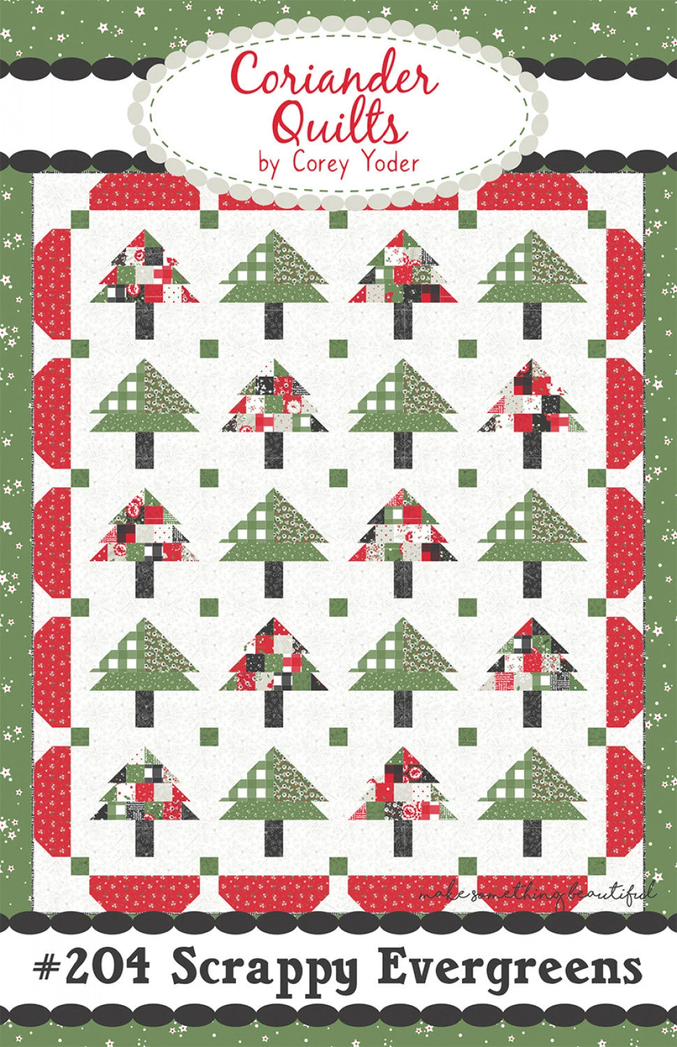 The Scrappy Evergreens quilt pattern finishes at 66″ x 80″ and is designed by Corey Yoder of Coriander Quilts. It features her Starberry fabric line for Moda fabrics. The quilt utilizes charm packs and mini charm packs. Scrappy Evergreens is an intermediate level quilt pattern. The booklet style pattern is full color and includes clear instructions and illustrations.