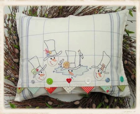 A whimsical series of snowmen pictured in each season. Stitch this wonderful pillow. Coloring and button embellishments add dimension to an already delightful project. 12in x 16in