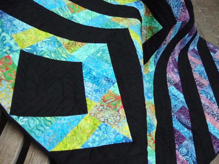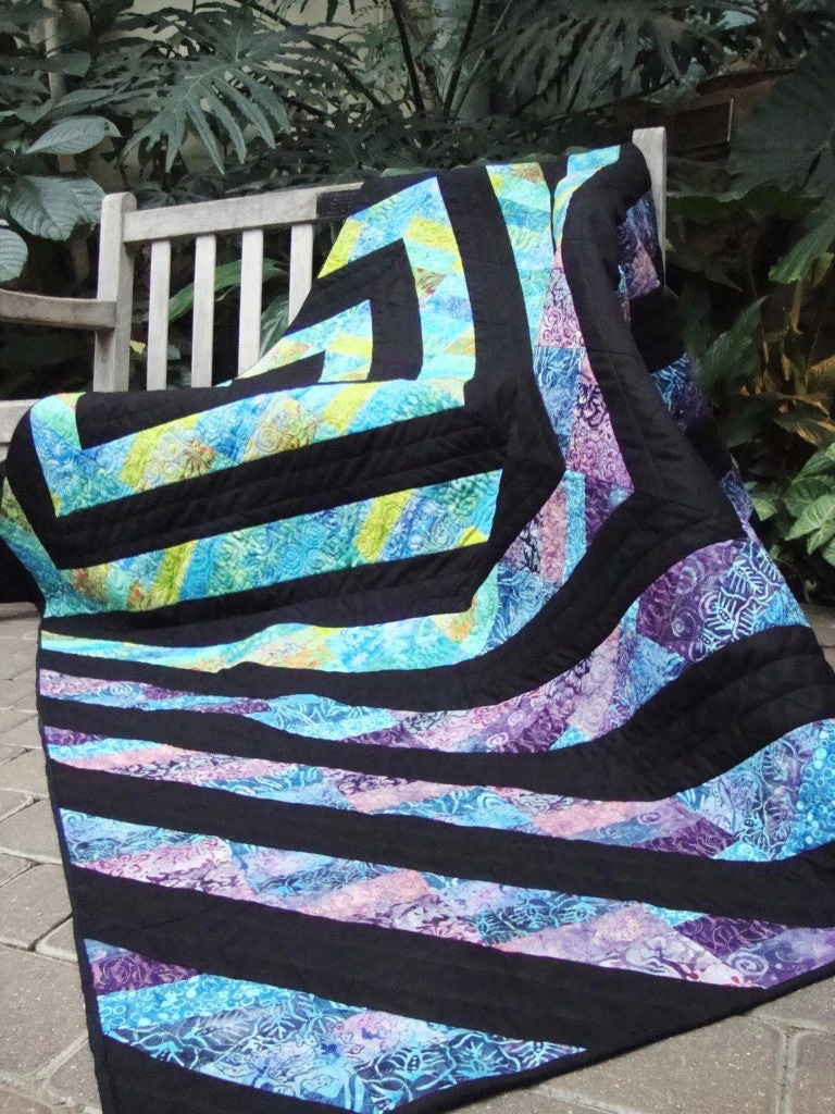 As the name suggests, Stripping in Paradise is made by combining strip piecing and a method that creates half-square triangles from squares. There are minimal matching seams, making the project very beginner friendly. 66″ square