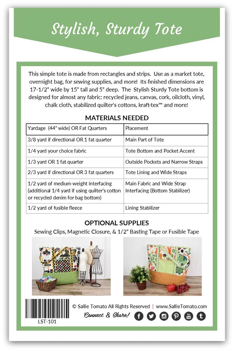 This simple tote is made from rectangles and strips. The Stylish Sturdy tote bottom is designed for almost any fabric: recycled jeans, canvas, oilcloth, vinyl, chalk cloth, stabilized quilter’s cottons, Kraft-Tex, cork, and more! All cutting layouts are drawn to scale. This pattern is fat quarter friendly and finished dimensions are 17-1/2in wide x 15in tall x 5in deep.