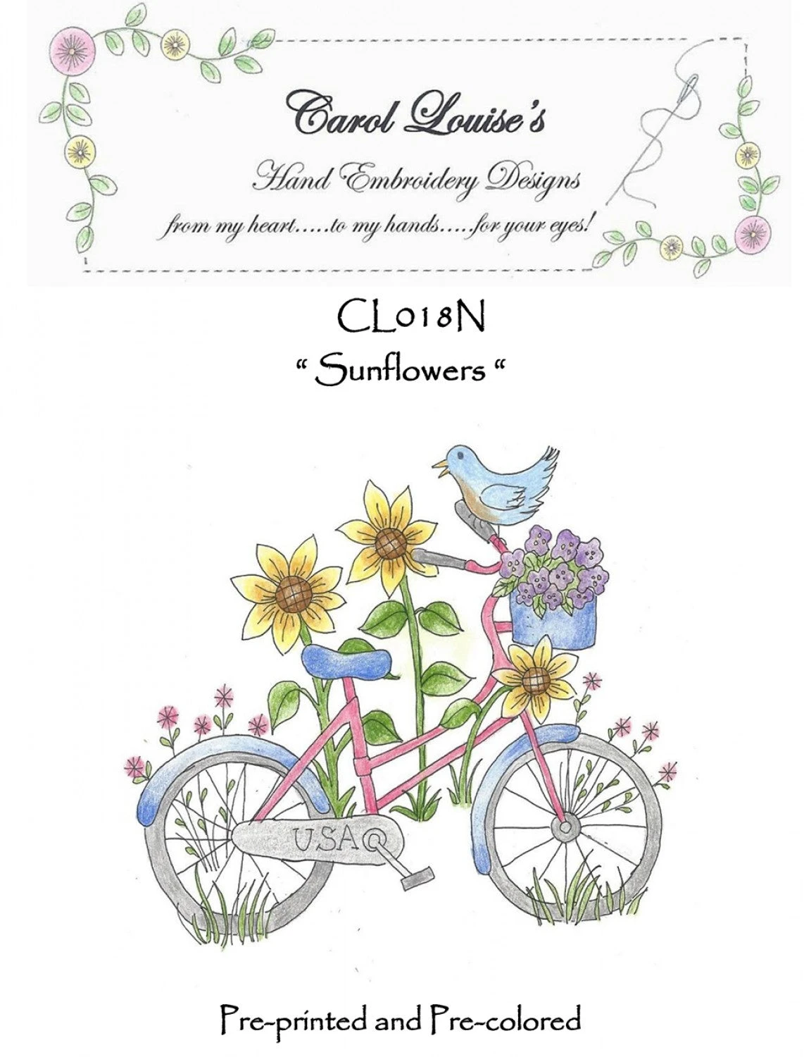 This pattern includes one pre-printed, pre-colored design that is ready to be hand embroidered.