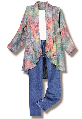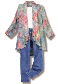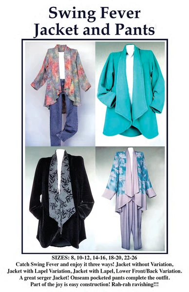Catch Swing Fever and enjoy it three ways! Jacket without Variation, Jacket with Lapel Variation, Jacket with Lapel, Lower Front/Back Variation. A great serger Jacket! Onseam pocketed pants complete the outfit. Part of the joy is easy construction! Rah-rah ravishing!!!