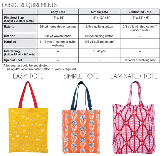 This pattern will walk you through three different variations of tote bags designed for the beginning sewer in mind. The variations will teach you how to make handles, insert gussets, add a slip pocket, and more!