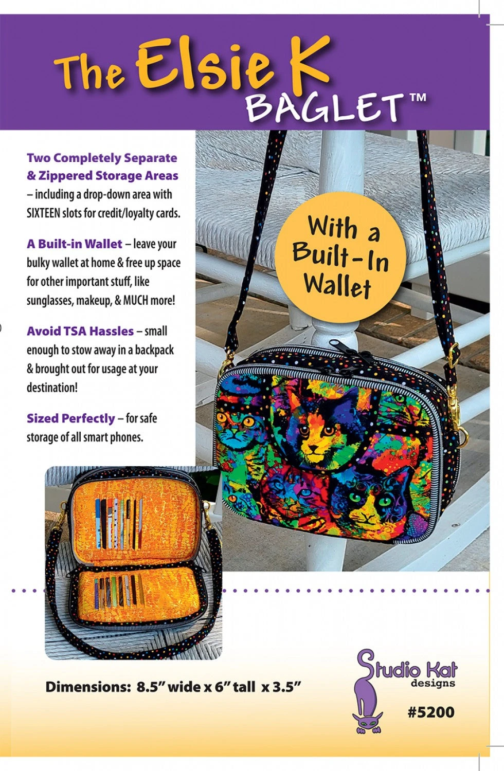 Finished size- 8.5in wide x 6in tall x 3.5in. The Elsie K Baglet includes a built-in Wallet which frees up space for plenty of other things . It’s also sized perfectly for all smart phones and also can be stowed away in a backpack to avoid hassles at TSA (and brought out for usage at your destination).