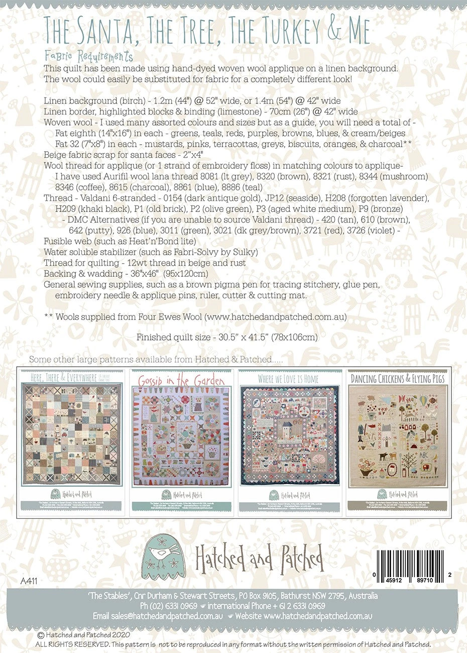 Finished Size 36.5 x 41.5 inches. The Santa, The Tree, The Turkey and Me. This one has been SO much fun to stitch with simple woven wool applique and stitchery.
