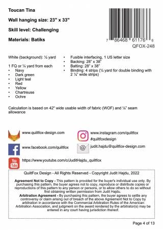 Toucan Tina is a small wall hanging from bold batiks. The quilt is somewhat challenging due to the curved piecing technique.