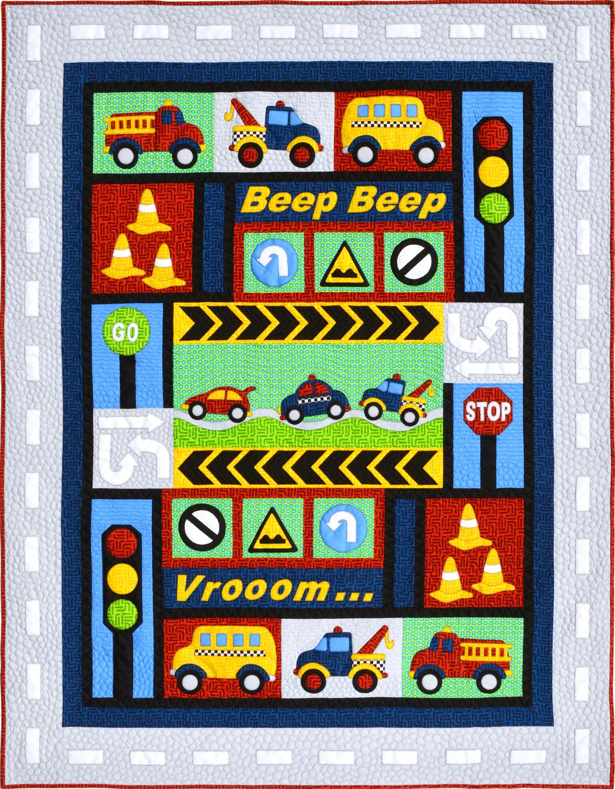 Traffic Jam… A super cool single/twin bed quilt for boys. With applique vehicles and traffic signs.