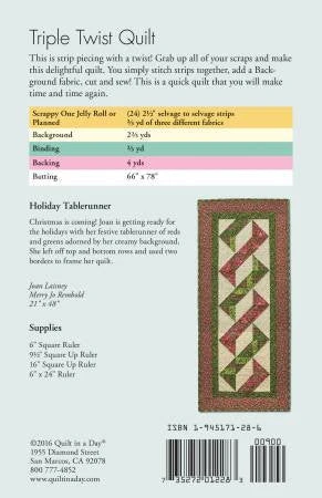 56in x 68in or 64in x 82in. This is strip piecing with a twist! Grab up all of your scraps and make this delightful quilt. You simply stitch strips together, add a background fabric, cut and sew! This is a quick quilt that you will make time and time again. Jelly Roll (2 1/2 strip) friendly!